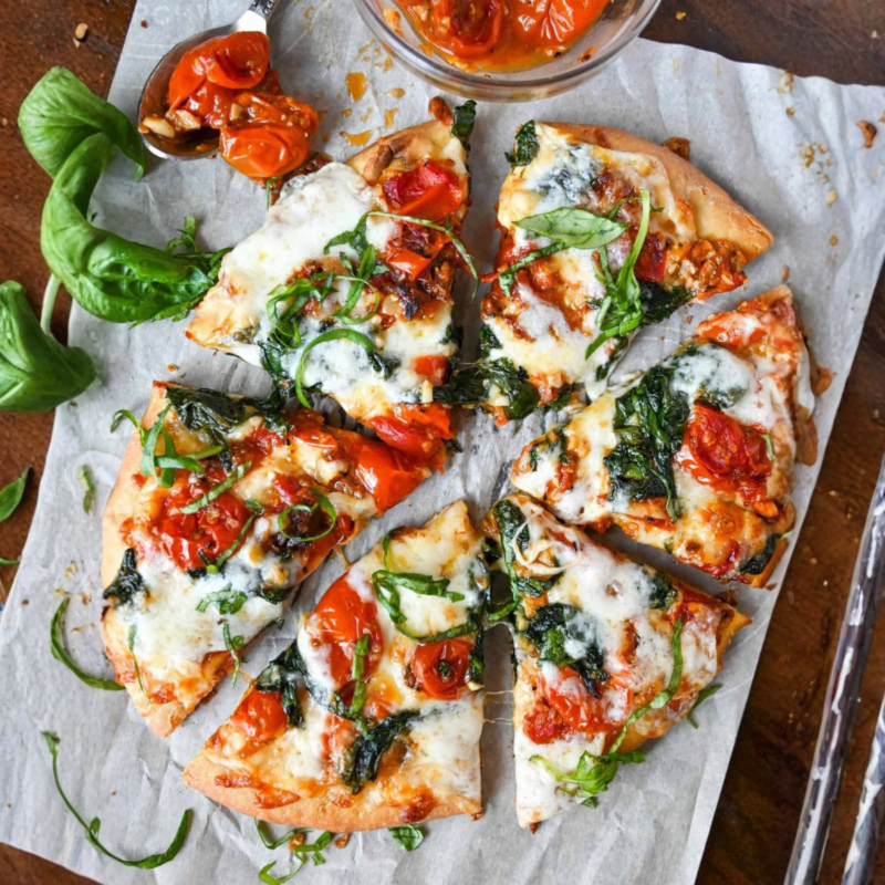 Loaded veggie pizza with spinach, mushrooms, olives, poblano peppers, and fresh basil.
